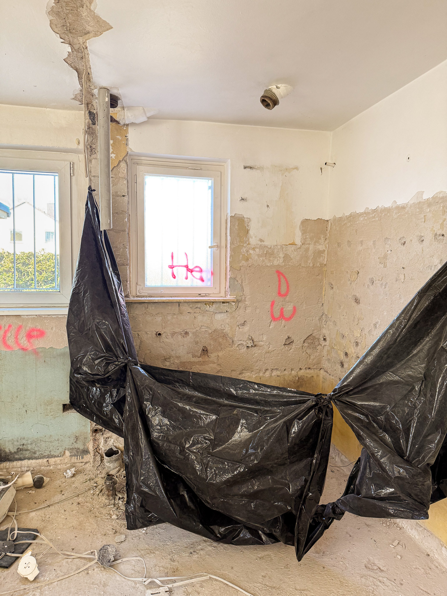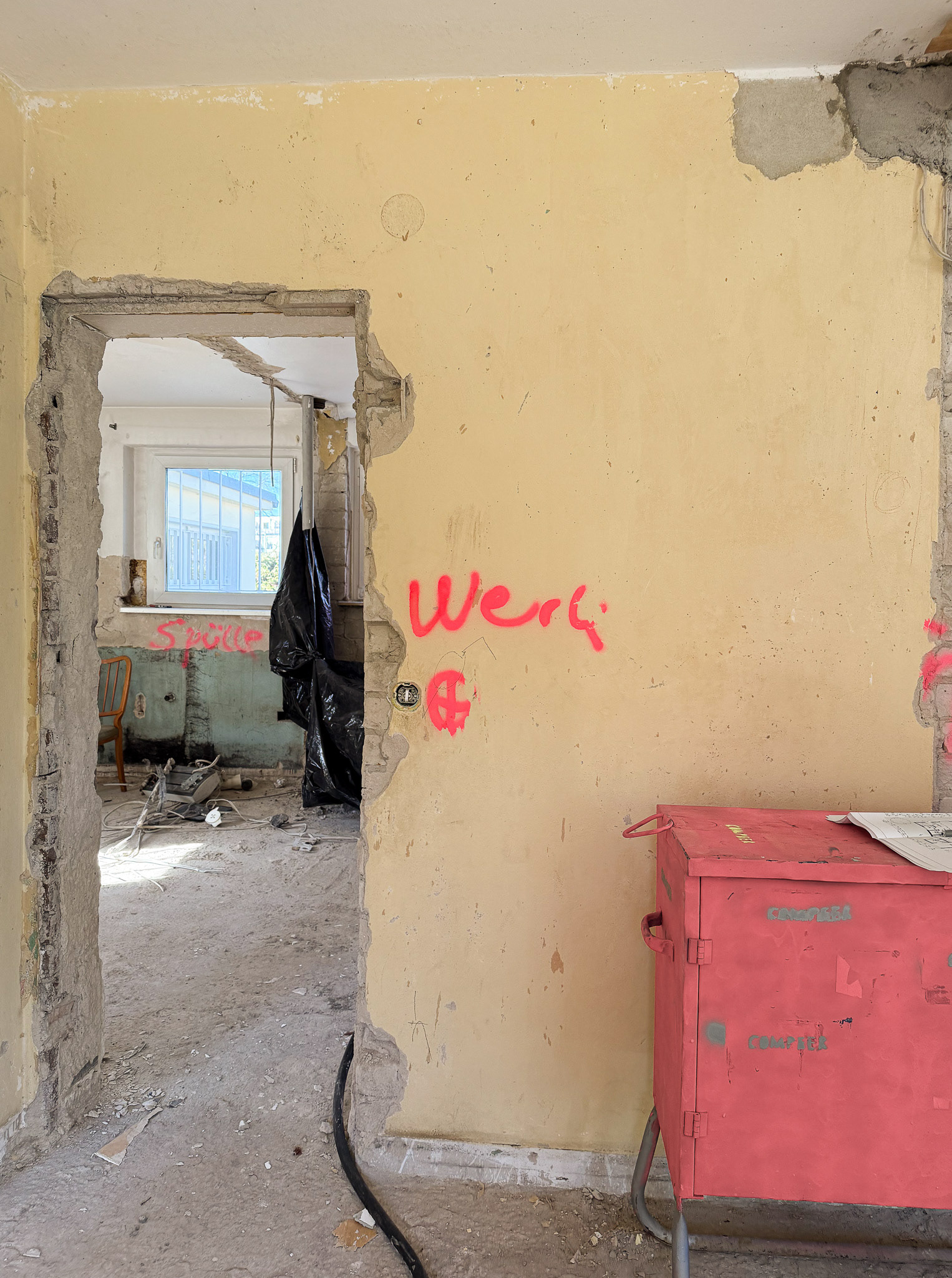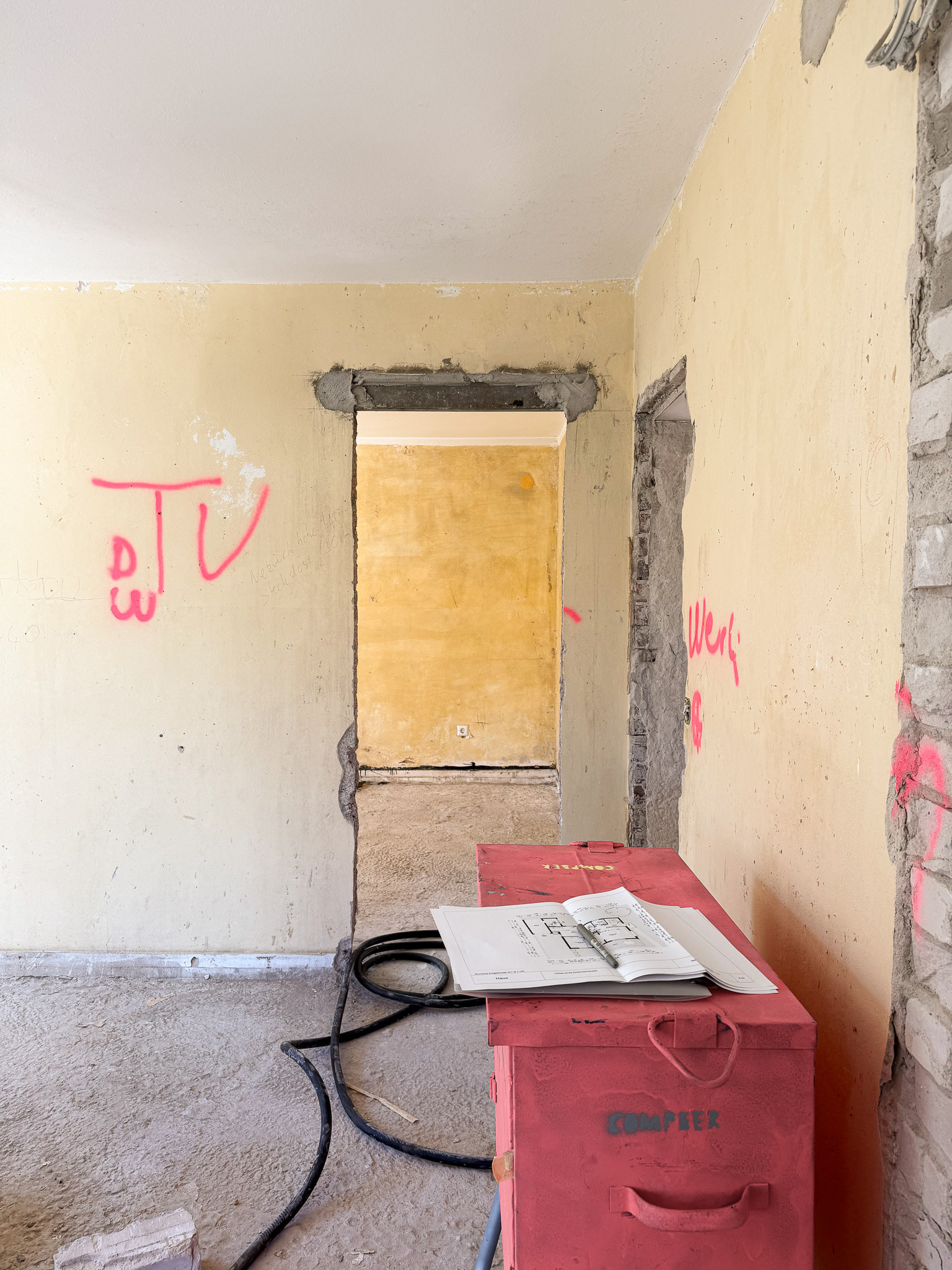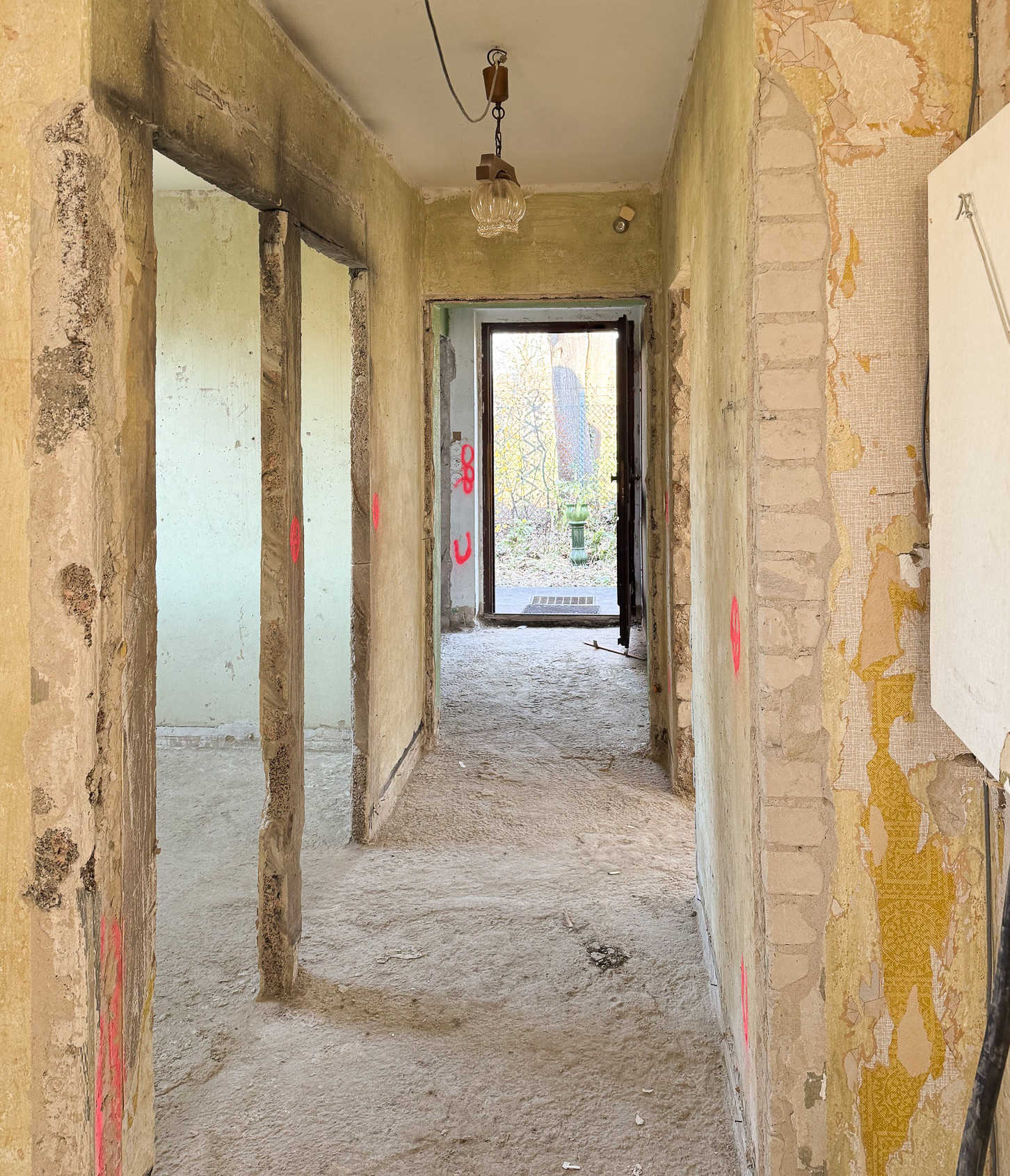 Momentan läuft die Entkernung des Gebäudes – nichttragende Wände und alte Installationen werden entfernt, um Platz für die neue Raumaufteilung zu schaffen.