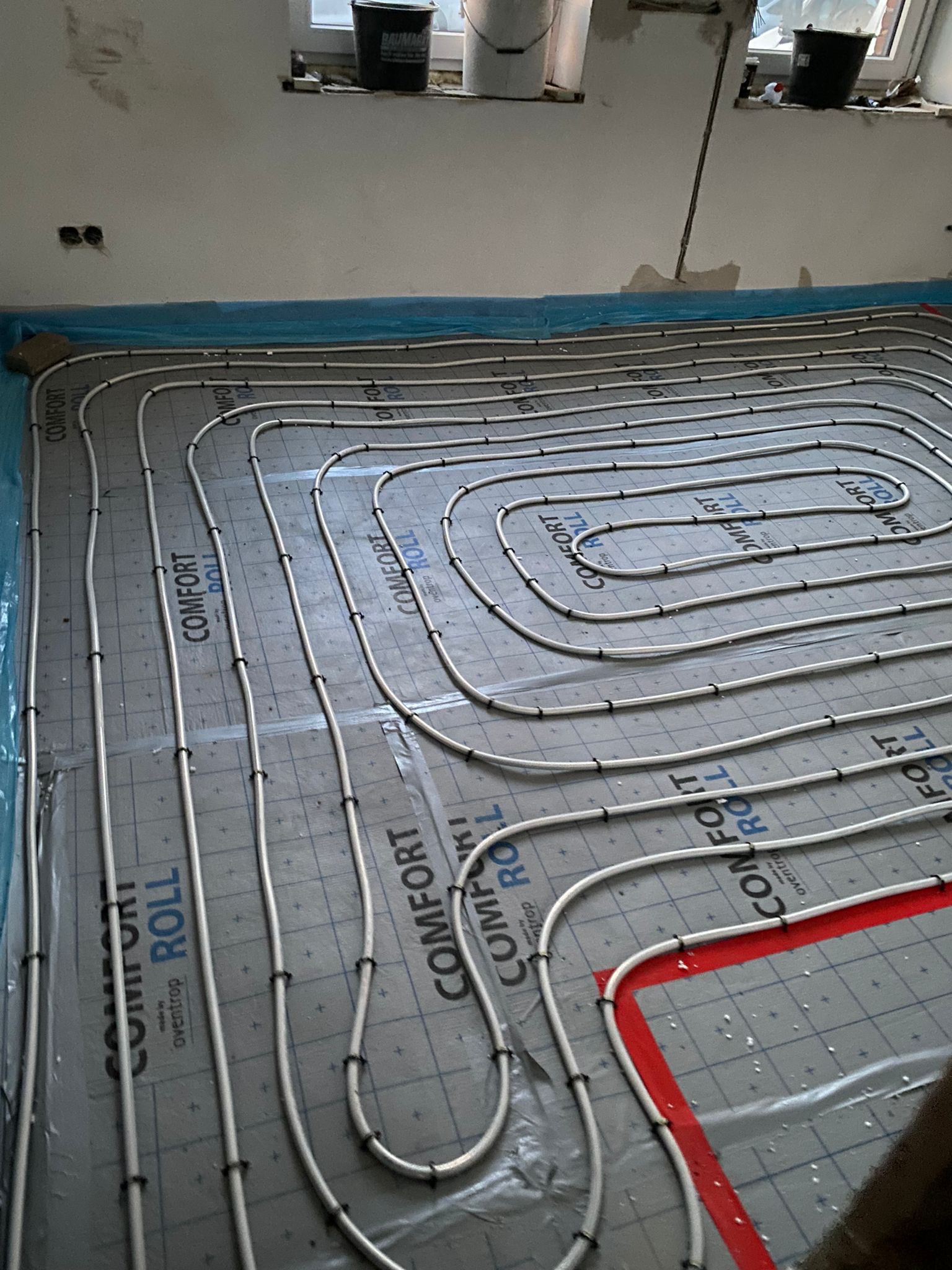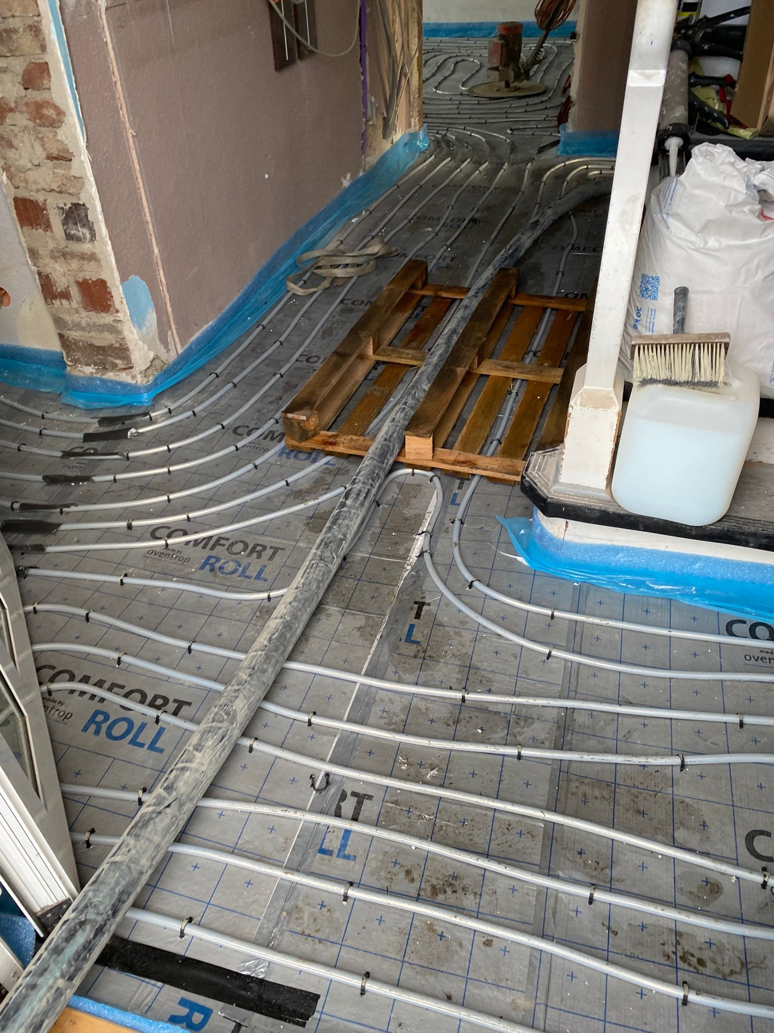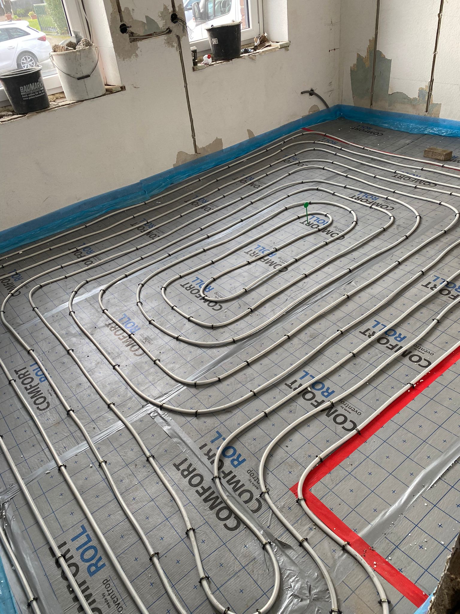 Nachdem die alten Fenster durch elektrisch bedienbare, zweifach verglaste Fenster ersetzt wurden, bekommt der Altbau nun auch endlich eine neue Haustechnik. Im Erdgeschoss wurden die Leitungen für die Fußbodenheizung verlegt und auch schon der Heizestrich gegossen. Die dazugehörigen Anlagen wurden erfolgreich im Technikraum im Untergeschoss aufgestellt und installiert.